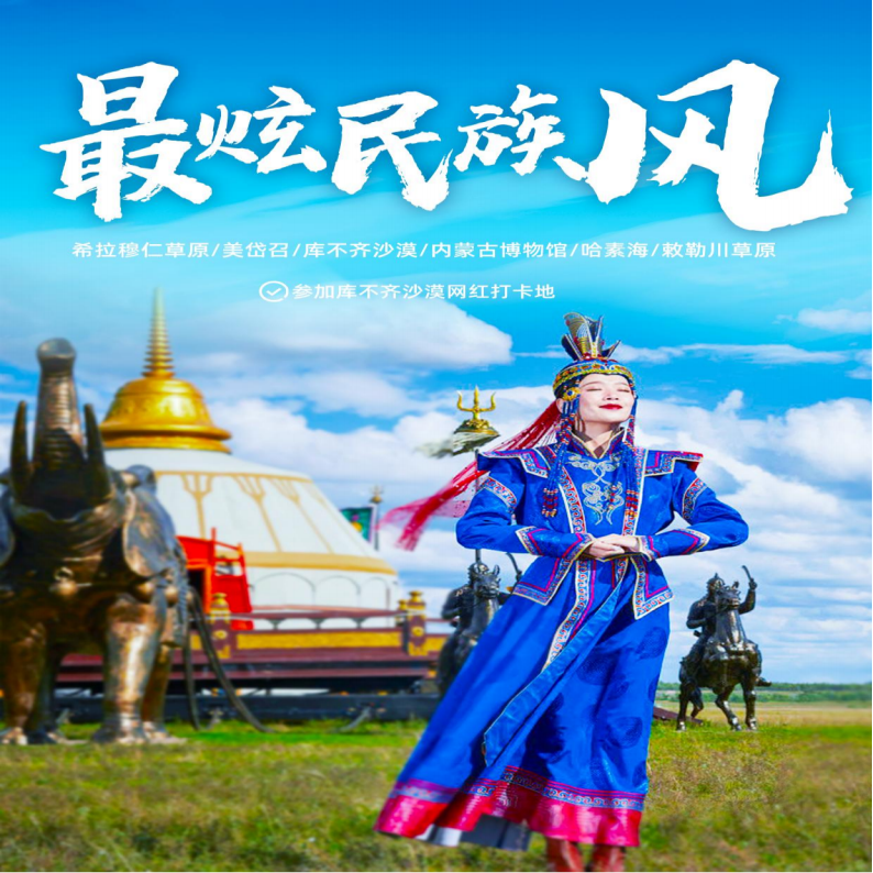 内蒙古5日游(希拉穆仁草原+响沙湾沙漠+敕勒川草原+恪靖公主府)